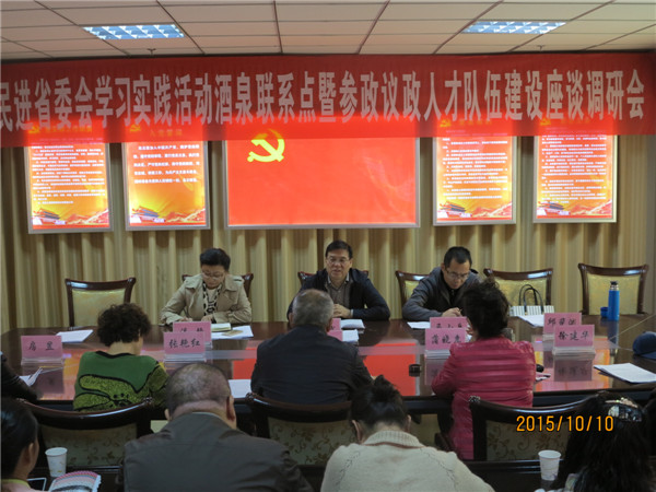 10月10日上午,民进甘肃省委员会学习社会主义实践活动酒泉联系点暨参政议政人才队伍建设座谈调研会在酒泉召开,民进酒泉市委员会主委柳渊主持了会议,肃州区干部支部部分会员、老会员及企业家会员等参加了会议。酒泉市统战部常委副部长蒲晓慧出席会议并讲话。 柳渊向省委会尚主委一行汇报了参政议政人才队伍建设情况,尚勋武主委对人才队伍建设给予了指导意见,并希望酒泉市委会进一步调动全体会员的参政热情,整体提高参政党履行参政议政的能力和水平。